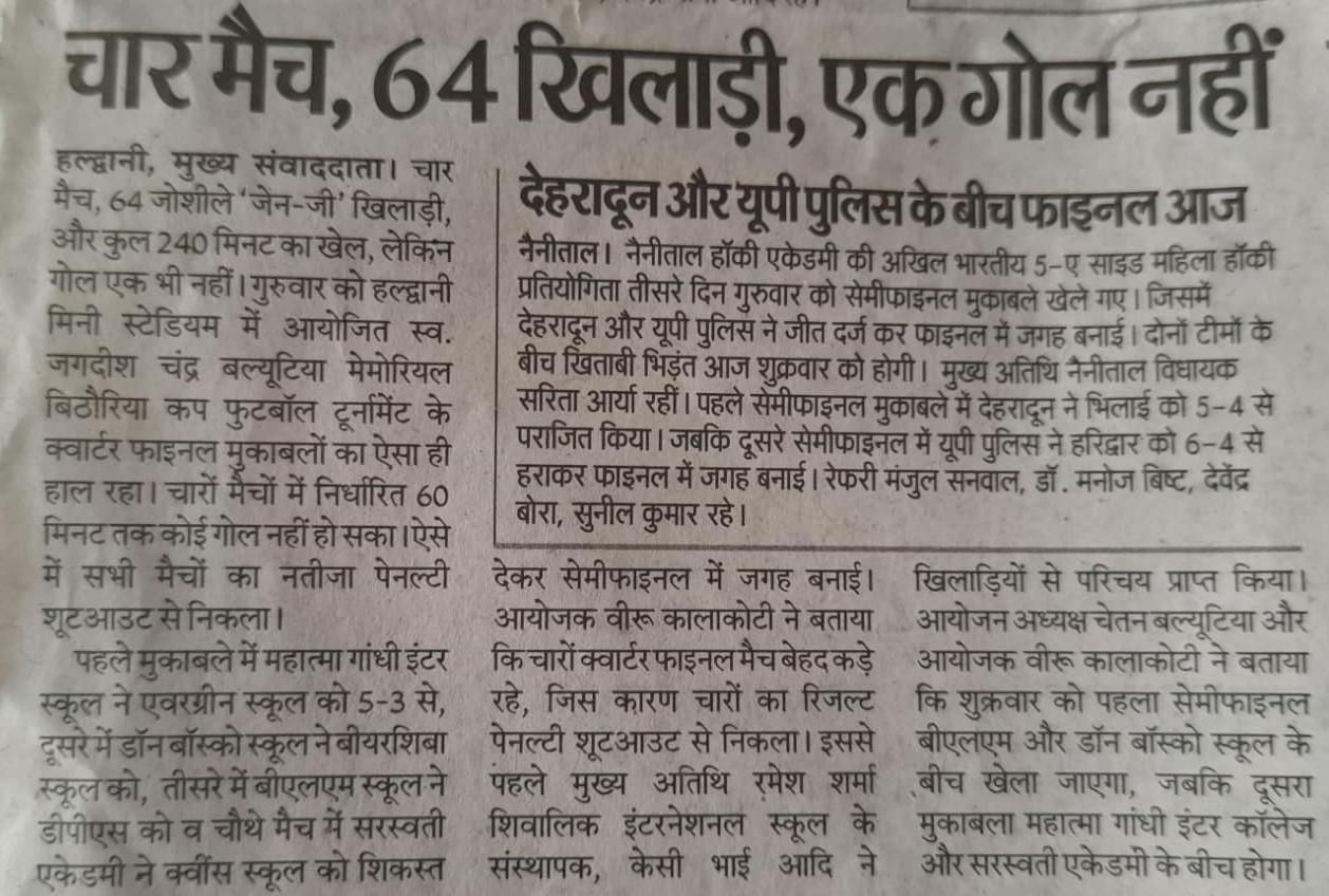 चार मैच, 64 जोशीले 'जेन-जी' खिलाड़ी, और कुल 240 मिनट का खेल, लेकिन गोल एक भी नहीं। गुरुवार को हल्द्वानी मिनी स्टेडियम में आयोजित स्व. जगदीश चंद्र बल्यूटिया मेमोरियल बिठौरिया कप फुटबॉल टूर्नामेंट के क्वार्टर फाइनल मुकाबलों का ऐसा ही हाल रहा। चारों मैचों में निर्धारित 60 मिनट तक कोई गोल नहीं हो सका। ऐसे में सभी मैचों का नतीजा पेनल्टी शूटआउट से निकला। पहले मुकाबले में महात्मा गांधी इंटर स्कूल ने एवरग्रीन स्कूल को 5-3 से, दूसरे में डॉन बॉस्को स्कूल नेबीयरशिबा स्कूल को, तीसरे में बीएलएम स्कूल ने डीपीएस को व चौथे मैच में सरस्वती एकेडमी ने क्वींस स्कूल को शिकस्त देकर सेमीफाइनल में जगह बनाई। आयोजक वीरू कालाकोटी ने बताया कि चारों क्वार्टर फाइनल मैच बेहद कड़े रहे, जिस कारण चारों का रिजल्ट पेनल्टी शूटआउट से निकला। इससे पहले मुख्य अतिथि रमेश शर्मा शिवालिक इंटरनेशनल स्कूल के संस्थापक, केसी भाई आदि ने खिलाड़ियों से परिचय प्राप्त किया। आयोजन अध्यक्ष चेतन बल्यूटिया और आयोजक वीरू कालाकोटी ने बताया कि शुक्रवार को पहला सेमीफाइनल बीएलएम और डॉन बॉस्को स्कूल के बीच खेला जाएगा, जबकि दूसरा मुकाबला महात्मा गांधी इंटर कॉलेज और सरस्वती एकेडमी के बीच होगा।