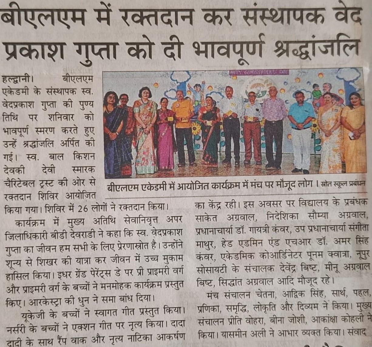 बीएलएम एकेडमी के संस्थापक स्व. वेदप्रकाश गुप्ता की पुण्य तिथि पर शनिवार को भावपूर्ण स्मरण करते हुए उन्हें श्रद्धांजलि अर्पित की गई। स्व. बाल किशन देवकी देवी स्मारक चैरिटेबल ट्रस्ट की ओर से रक्तदान शिविर आयोजित किया गया। शिविर में 26 लोगों ने रक्तदान किया। कार्यक्रम में मुख्य अतिथि सेवानिवृत्त अपर जिलाधिकारी बीडी देवराडी ने कहा कि स्व. वेदप्रकाश गुप्ता का जीवन हम सभी के लिए प्रेरणास्त्रोत है। उन्होंने शून्य से शिखर की यात्रा कर जीवन में उच्च मुकाम हासिल किया। इधर ग्रैंड पेरेंट्स डे पर प्री प्राइमरी वर्ग और प्राइमरी वर्ग के बच्चों ने मनमोहक कार्यक्रम प्रस्तुत किए। आरकेस्ट्रा की धुन ने समा बांध दिया। यूकेजी के बच्चों ने स्वागत गीत प्रस्तुत किया। नर्सरी के बच्चों ने एक्शन गीत पर नृत्य किया। दादा दादी के साथ रैंप वाक और नृत्य नाटिका आकर्षण का केंद्र रही। इस अवसर पर विद्यालय के प्रबंधक साकेत अग्रवाल, निदेशिका सौम्या अग्रवाल, प्रधानाचार्या डॉ. गायत्री कंवर, उप प्रधानाचार्या संगीता माथुर, हेड एडमिन एंड एचआर डॉ. अमर सिंह कंवर, एकेडमिक कोआर्डिनेटर पूनम क्वात्रा, नूपुर सोसायटी के संचालक देवेंद्र बिष्ट, मीनू अग्रवाल बिष्ट, सिद्धांत अग्रवाल आदि मौजूद रहे। मंच संचालन चेतना, आद्विक सिंह, सार्थ, पहल, प्रणिका, समृद्धि, लोकृति और दिव्यम ने किया। मुख्य संचालन प्रीति वोहरा, बीना जोशी, आकांक्षा कोहली ने किया। यासमीन अली ने आभार व्यक्त किया।