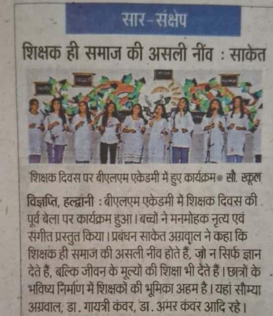 बीएलएम एकेडमी में शिक्षक दिवस की पूर्व बेला पर कार्यक्रम हुआ। बच्चों ने मनमोहक नृत्य एवं संगीत प्रस्तुत किया। प्रबंधन साकेत अग्रवाल ने कहा कि शिक्षक ही समाज की असली नींव होते हैं, जो न सिर्फ ज्ञान देते हैं, बल्कि जीवन के मूल्यों की शिक्षा भी देते हैं। छात्रों के भविष्य निर्माण में शिक्षकों की भूमिका अहम है। यहां सौम्या अग्रवाल, डा. गायत्री कंवर, डा. अमर कंवर आदि रहे।