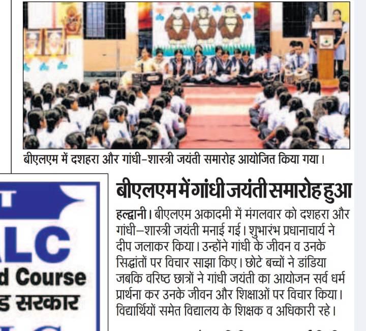 बीएलएम अकादमी में मंगलवार को दशहरा और गांधी-शास्त्री जयंती मनाई गई। शुभारंभ प्रधानाचार्य ने दीप जलाकर किया। उन्होंने गांधी के जीवन व उनके सिद्धांतों पर विचार साझा किए। छोटे बच्चों ने डांडिया जबकि वरिष्ठ छात्रों ने गांधी जयंती का आयोजन सर्व धर्म प्रार्थना कर उनके जीवन और शिक्षाओं पर विचार किया। विद्यार्थियों समेत विद्यालय के शिक्षक व अधिकारी रहे।