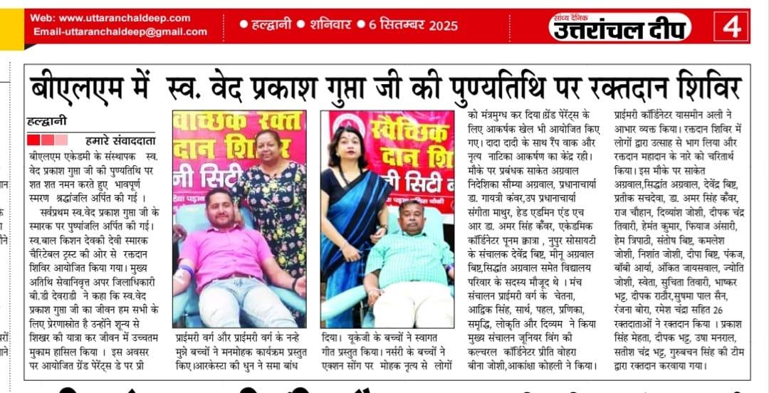 सर्वप्रथम स्व. वेद प्रकाश गुप्ता जी के स्मारक पर पुष्पांजलि अर्पित की गई। स्व. बाल किशन देवकी देवी स्मारक चैरिटेबल ट्रस्ट की ओर से रक्तदान शिविर आयोजित किया गया। मुख्य अतिथि सेवानिवृत्त अपर जिलाधिकारी बी.डी देवराडी ने कहा कि स्व. वेद प्रकाश गुप्ता जी का जीवन हम सभी के लिए प्रेरणास्त्रोत है उन्होंने शून्य से शिखर की यात्रा कर जीवन में उच्चतम मुकाम हासिल किया। इस अवसर पर आयोजित ग्रेड पेरेंट्स डे पर प्री प्राईमरी वर्ग और प्राईमरी वर्ग के नन्हे मुन्ने बच्चों ने मनमोहक कार्यक्रम प्रस्तुत किए। आरकेस्टा की धुन ने समा बांध दिया। यूकेजी के बच्चों ने स्वागत गीत प्रस्तुत किया। नर्सरी के बच्चों ने एक्शन सोंग पर मोहक नृत्य से लोगों को मंत्रमुग्ध कर दिया होंड पेरेंट्स के लिए आकर्षक खेल भी आयोजित किए गए। दादा दादी के साथ रैंप वाक और नृत्य नाटिका आकर्षण का केंद्र रही। मौके पर प्रबंधक साकेत अग्रवाल निर्देशिका सौम्या अग्रवाल, प्रधानाचार्या डा. गायत्री कंवर, उप प्रधानाचार्या संगीता माथुर, हेड एडमिन एंड एच आर डा. अमर सिंह कँवर, एकेडमिक कॉर्डिनेटर पूनम क्वात्रा, नुपुर सोसायटी के संचालक देवेंद्र बिष्ट, मीनू अग्रवाल बिष्ट, सिद्धांत अग्रवाल समेत विद्यालय परिवार के सदस्य मौजूद थे। मंच संचालन प्राईमरी वर्ग के चेतना, आद्विक सिंह, सार्थ, पहल, प्रणिका, समृद्धि, लोक्ति और दिव्यम ने किया मुख्य संचालन जूनियर विंग कौ कल्चरल कॉर्डिनेटर प्रीति वोहरा बीना जोशी, आकांक्षा कोहली ने किया। प्राईमरी कॉर्डिनेटर यासमीन अली ने आभार व्यक्त किया। रक्तदान शिविर में लोगों द्वारा उत्साह से भाग लिया और रक्तदान महादान के नारे को चरितार्थ किया। इस मौके पर साकेत
