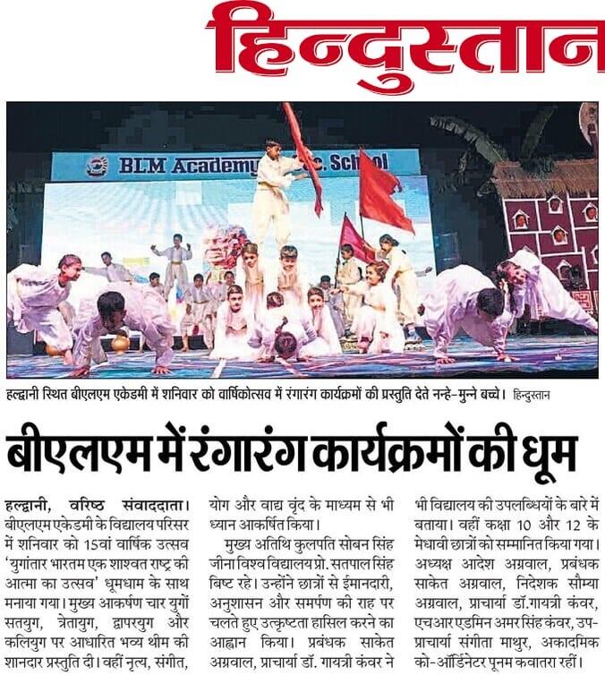 बीएलएम एकेडमी के विद्यालय परिसर में शनिवार को 15वां वार्षिक उत्सव 'युगांतार भारतम एक शाश्वत राष्ट्र की आत्मा का उत्सव' धूमधाम के साथ मनाया गया। मुख्य आकर्षण चार युगों सतयुग, त्रेतायुग, द्वापरयुग और कलियुग पर आधारित भव्य थीम की शानदार प्रस्तुति दी। वहीं नृत्य, संगीत, योग और वाद्य वृंद के माध्यम से भी ध्यान आकर्षित किया। मुख्य अतिथि कुलपति सोबन सिंह जीना विश्व विद्यालय प्रो. सतपाल सिंह बिष्ट रहे। उन्होंने छात्रों से ईमानदारी, अनुशासन और समर्पण की राह पर चलते हुए उत्कृष्टता हासिल करने का आह्वान किया। प्रबंधक साकेत अग्रवाल, प्राचार्या डॉ. गायत्री कंवर ने भी विद्यालय की उपलब्धियों के बारे में बताया। वहीं कक्षा 10 और 12 के मेधावी छात्रों को सम्मानित किया गया। अध्यक्ष आदेश अग्रवाल, प्रबंधक साकेत अग्रवाल, निदेशक सौम्या अग्रवाल, प्राचार्या डॉ. गायत्री कंवर, एचआर एडमिन अमर सिंह कंवर, उप-प्राचार्या संगीता माथुर, अकादमिक को-ऑर्डिनेटर पूनम कवातरा रहीं।