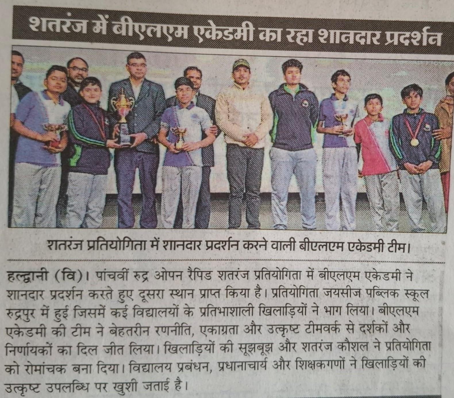 पांचवीं रुद्र ओपन रैपिड शतरंज प्रतियोगिता में बीएलएम एकेडमी ने शानदार प्रदर्शन करते हुए दूसरा स्थान प्राप्त किया है। प्रतियोगिता जयसीज पब्लिक स्कूल रुद्रपुर में हुई जिसमें कई विद्यालयों के प्रतिभाशाली खिलाड़ियों ने भाग लिया। बीएलएम एकेडमी की टीम ने बेहतरीन रणनीति, एकाग्रता और उत्कृष्ट टीमवर्क से दर्शकों और निर्णायकों का दिल जीत लिया। खिलाड़ियों की सूझबूझ और शतरंज कौशल ने प्रतियोगिता को रोमांचक बना दिया। विद्यालय प्रबंधन, प्रधानाचार्य और शिक्षकगणों ने खिलाड़ियों की उत्कृष्ट उपलब्धि पर खुशी जताई है।