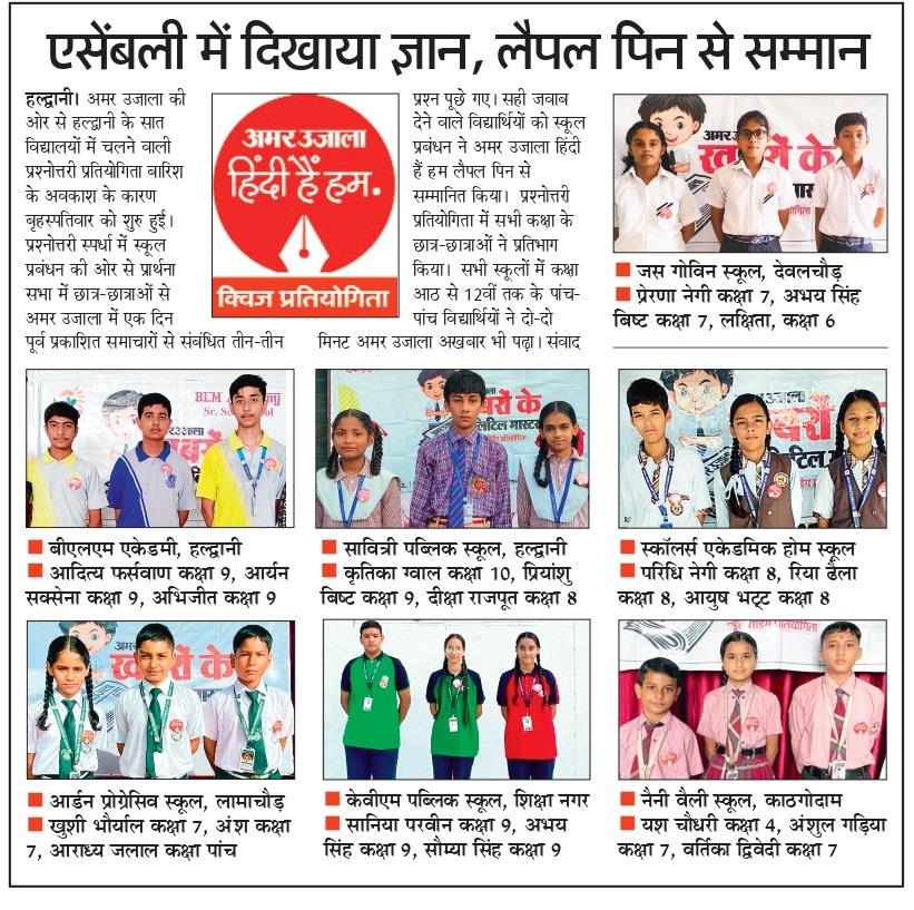 असेंबली में दिखाया ज्ञान, लैपल पिन से सम्मान अमर उजाला की ओर से हल्द्वानी के सात विद्यालयों में चलने वाली प्रश्नोत्तरी प्रतियोगिता बारिश के अवकाश के कारण बृहस्पतिवार को शुरु हुई। प्रश्नोत्तरी स्पर्धा में स्कूल प्रबंधन की ओर से प्रार्थना सभा में छात्र-छात्राओं से अमर उजाला में एक दिन पूर्व प्रकाशित समाचारों से संबंधित तीन-तीन प्रश्न पूछे गए। सही जवाब देने वाले विद्यार्थियों को स्कूल प्रबंधन ने अमर उजाला हिंदी हैं हम लैपल पिन से सम्मानित किया। प्रश्नोत्तरी प्रतियोगिता में सभी कक्षा के छात्र-छात्राओं ने प्रतिभाग किया। सभी स्कूलों में कक्षा आठ से 12वीं तक के पांच-पांच विद्यार्थियों ने दो-दो मिनट अमर उजाला अखबार भी पढ़ा। बीएलएम एकेडमी, हल्द्वानी आदित्य फर्सवाण कक्षा 9, आर्यन सक्सेना कक्षा 9, अभिजीत कक्षा 9