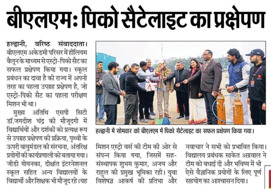 बीएलएम अकेडमी परिसर में हीलियम बैलून के माध्यम से एस्ट्रो-पिको सैट का सफल प्रक्षेपण किया गया। स्कूल प्रबंधन का दावा है की राज्य में अपनी तरह का पहला उपग्रह प्रक्षेपण है, जो एस्ट्रो-पिको सैट का पहला परीक्षण मिशन भी था। मुख्य अतिथि एसपी सिटी डॉ. जगदीश चंद्र की मौजूदगी में विद्यार्थियों और दर्शकों को प्रत्यक्ष रूप से उपग्रह प्रक्षेपण की प्रक्रिया, पृथ्वी के ऊपरी वायुमंडल की संरचना, अंतरिक्ष प्रयोगों की कार्यप्रणाली को बताया गया। जीडी गोयनका, दीक्षांत इंटरनेशनल स्कूल सहित अन्य विद्यालयों के विद्यार्थी और शिक्षक भी मौजूद रहे। यह मिशन एस्ट्रो वर्स की टीम की ओर से संपन्न किया गया, जिसमें सह-संस्थापक शुभम कुमार, अजय और राहुल की प्रमुख भूमिका रही। युवा विशेषज्ञ आकर्ष की प्रतिभा और नवाचार ने सभी को प्रभावित किया। विद्यालय प्रबंधक साकेत अग्रवाल ने टीम को बधाई दी और भविष्य में भी ऐसे वैज्ञानिक प्रयोगों के लिए पूर्ण सहयोग का आश्वासन दिया।