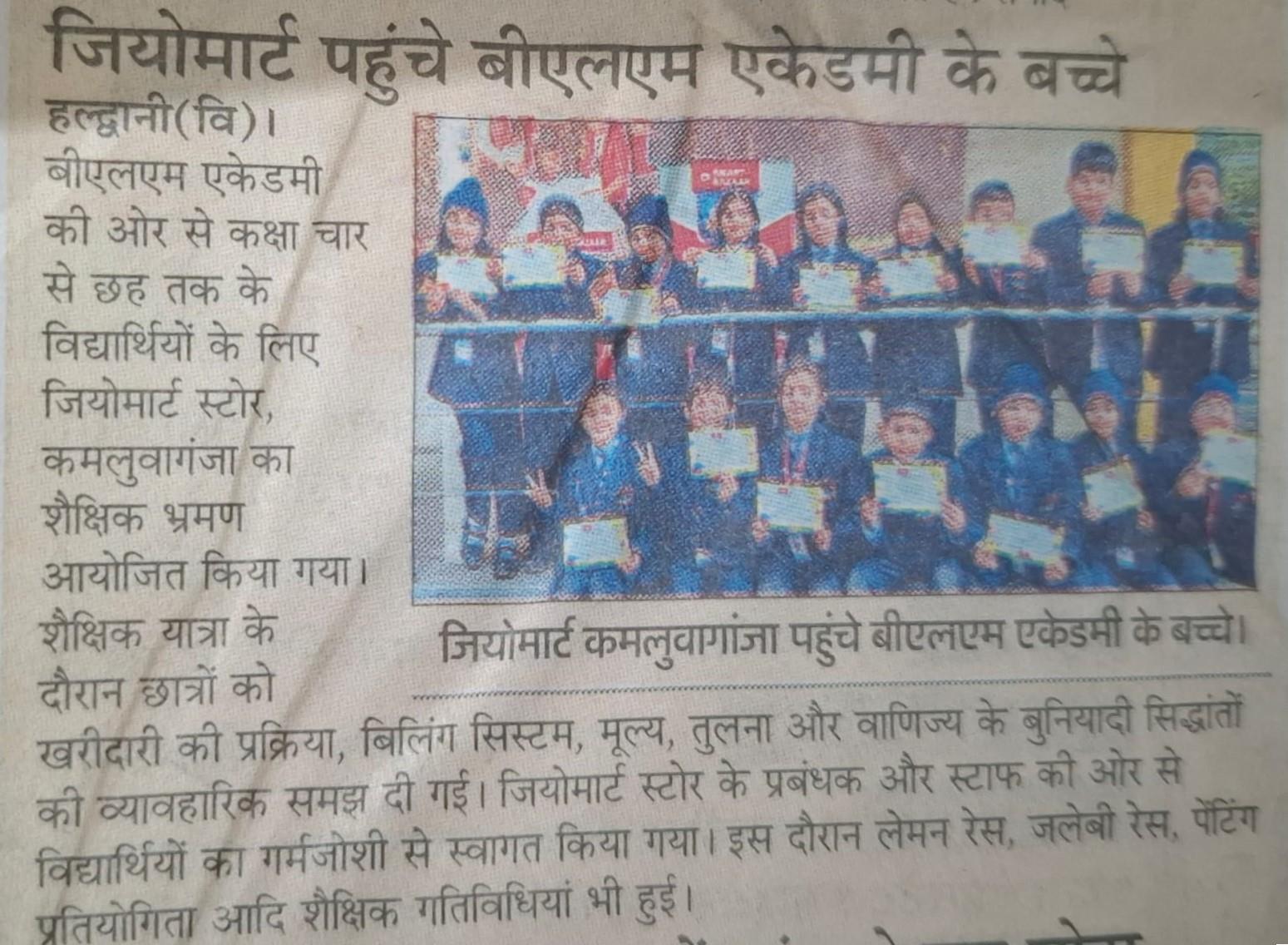 बीएलएम एकेडमी की ओर से कक्षा चार से छह तक के विद्यार्थियों के लिए जियोमार्ट स्टोर, कमलुवागंजा का शैक्षिक भ्रमण आयोजित किया गया। शैक्षिक यात्रा के दौरान छात्रों को खरीदारी की प्रक्रिया, बिलिंग सिस्टम, मूल्य, तुलना और वाणिज्य के बुनियादी सिद्धांतों की व्यावहारिक समझ दी गई। जियोमार्ट स्टोर के प्रबंधक और स्टाफ की ओर से विद्यार्थियों का गर्मजोशी से स्वागत किया गया। इस दौरान लेमन रेस, जलेबी रेस, पेंटिंग प्रतियोगिता आदि शैक्षिक गतिविधियां भी हुई।