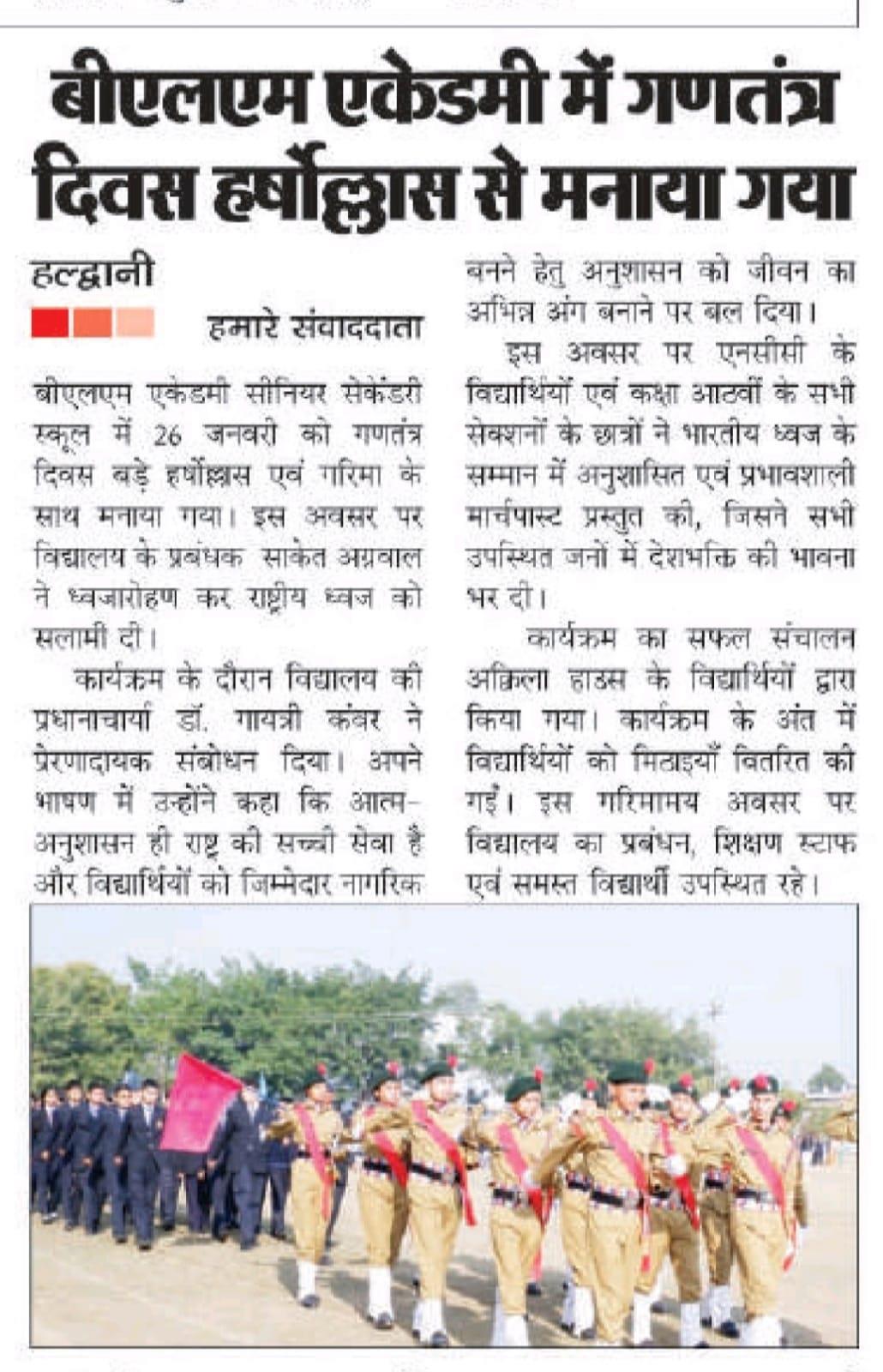 बीएलएम एकेडमी सीनियर सेकेंडरी स्कूल में 26 जनवरी को गणतंत्र दिवस बड़े हर्षोल्लास एवं गरिमा के साथ मनाया गया। इस अवसर पर विद्यालय के प्रबंधक साकेत अग्रवाल ने ध्वजारोहण कर राष्ट्रीय ध्वज को सलामी दी। कार्यक्रम के दौरान विद्यालय की प्रधानाचार्या डॉ. गायत्री कंवर ने प्रेरणादायक संबोधन दिया। अपने भाषण में उन्होंने कहा कि आत्म अनुशासन ही राष्ट्र की सच्ची सेवा है और विद्यार्थियों को जिम्मेदार नागरिक बनने हेतु अनुशासन को जीवन का अभिन्न अंग बनाने पर बल दिया। इस अवसर पर एनसीसी के विद्यार्थियों एवं कक्षा आठवीं के सभी सेक्शनों के छात्रों ने भारतीय ध्वज के सम्मान में अनुशासित एवं प्रभावशाली मार्चपास्ट प्रस्तुत की, जिसने सभी उपस्थित जनों में देशभक्ति की भावना भर दी। कार्यक्रम का सफल संचालन अक्तिला हाउस के विद्यार्थियों द्वारा किया गया। कार्यक्रम के अंत में विद्यार्थियों को मिठाइयाँ वितरित की गईं। इस गरिमामय अवसर पर विद्यालय का प्रबंधन, शिक्षण स्टाफ एवं समस्त विद्यार्थी उपस्थित रहे।
