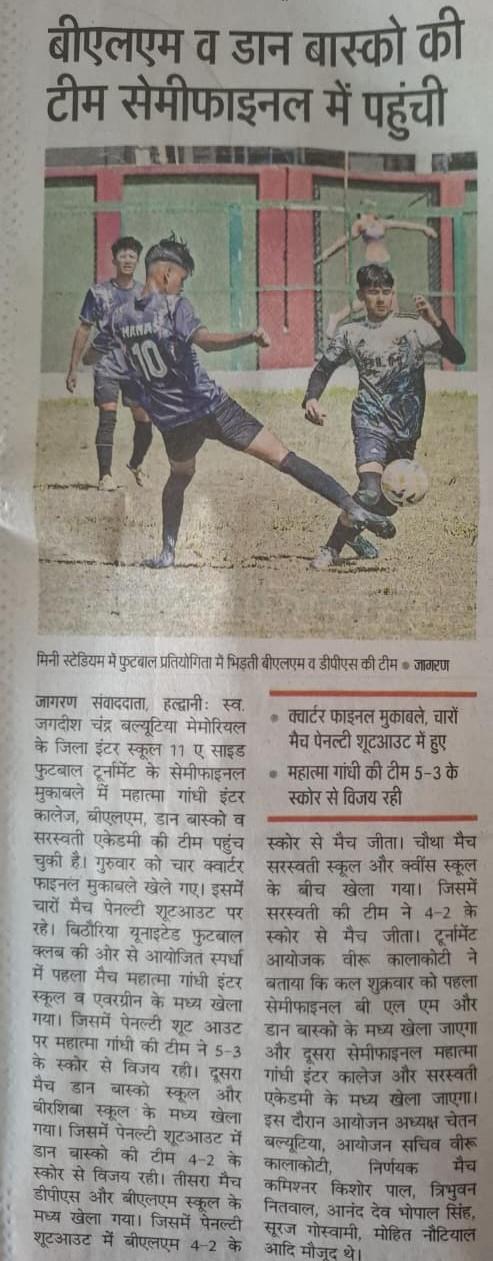 बीएलएम व डान बास्को की टीम सेमीफाइनल में पहुंची जागरण संवाददाता, हल्द्वानीः स्व. जगदीश चंद्र बल्यूटिया मेमोरियल के जिला इंटर स्कूल 11 ए साइड फुटबाल टूर्नामेंट के सेमीफाइनल मुकाबले में महात्मा गांधी इंटर कालेज, बीएलएम, डान बारको व सरस्वती एकेडमी की टीम पहुंच चुकी है। गुरुवार को चार क्वार्टर फाइनल मुकाबले खेले गए। इसमें चारों मैच पेनल्टी शूटआउट पर रहे। बिठौरिया यूनाइटेड फुटबाल क्लब की ओर से आयोजित स्पर्धा में पहला मैच महात्मा गांधी इंटर स्कूल व एवरग्रीन के मध्य खेला गया। जिसमें पेनल्टी शूट आउट पर महात्मा गांधी की टीम ने 5-3 के स्कोर से विजय रही। दूसरा मैच डान बास्को स्कूल और बीरशिबा स्कूल के मध्य खेला गया। जिसमें पेनल्टी शूटआउट में डान बास्को की टीम 4-2 के स्कोर से विजय रही। तीसरा मैच डीपीएस और बीएलएम स्कूल के मध्य खेला गया। जिसमें पेनल्टी शूटआउट में बीएलएम 4-2 के स्कोर से मैच जीता। चौथा मैच सरस्वती स्कूल और क्वींस स्कूल के बीच खेला गया। जिसमें सरस्वती की टीम ने 4-2 के स्कोर से मैच जीता। टूर्नामेंट आयोजक वीरू कालाकोटी ने बताया कि कल शुक्रवार को पहला सेमीफाइनल बी एल एम और डान बास्को के मध्य खेला जाएगा और दूसरा सेमीफाइनल महात्मा गांधी इंटर कालेज और सरस्वती एकेडमी के मध्य खेला जाएगा। इस दौरान आयोजन अध्यक्ष चेतन बल्यूटिया, आयोजन सचिव वीरू कालाकोटी, निर्णयक मैच कमिश्नर किशोर पाल, त्रिभुवन नितवाल, आनंद देव भोपाल सिंह, सूरज गोस्वामी, मोहित नौटियाल आदि मौजूद थे।
