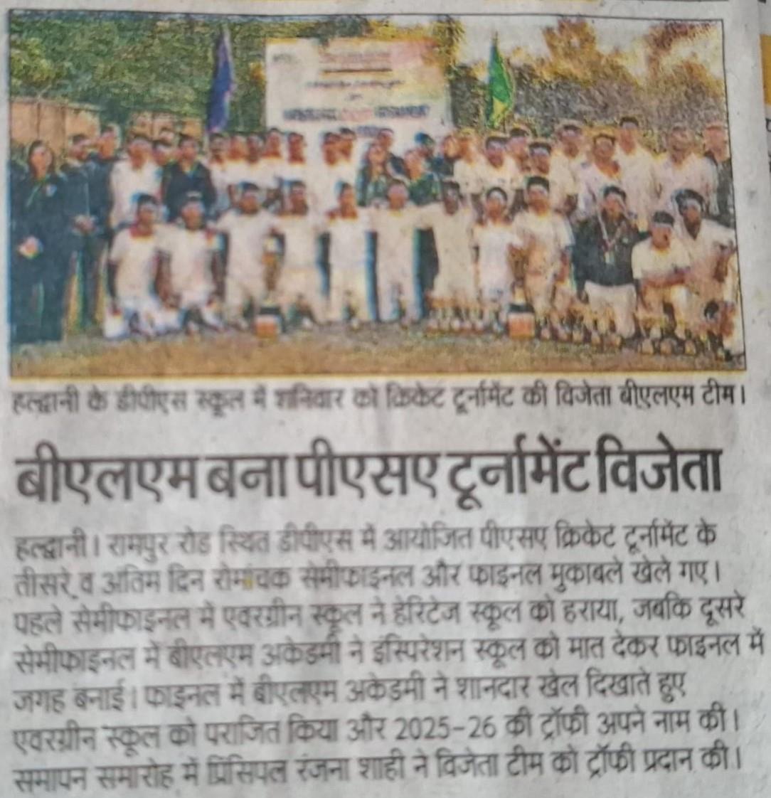 रामपुर रोड स्थित डीपीएस में आयोजित पीएसए क्रिकेट टूर्नामेंट के तीसरे व अंतिम दिन रोमांचक सेमीफाइनल और फाइनल मुकाबले खेले गए। पहले सेमीफाइनल में एवरग्रीन स्कूल ने हेरिटेज स्कूल को हराया, जबकि दूसरे सेमीफाइनल में बीएलएम अकेडमी ने इंस्पिरेशन स्कूल को मात देकर फाइनल में जगह बनाई। फाइनल में बीएलएम अकेडमी ने शानदार खेल दिखाते हुए एवरग्रीन स्कूल को पराजित किया और 2025-26 की ट्रॉफी अपने नाम की। समापन समारोह में प्रिंसिपल रंजना शाही ने विजेता टीम को ट्रॉफी प्रदान की।