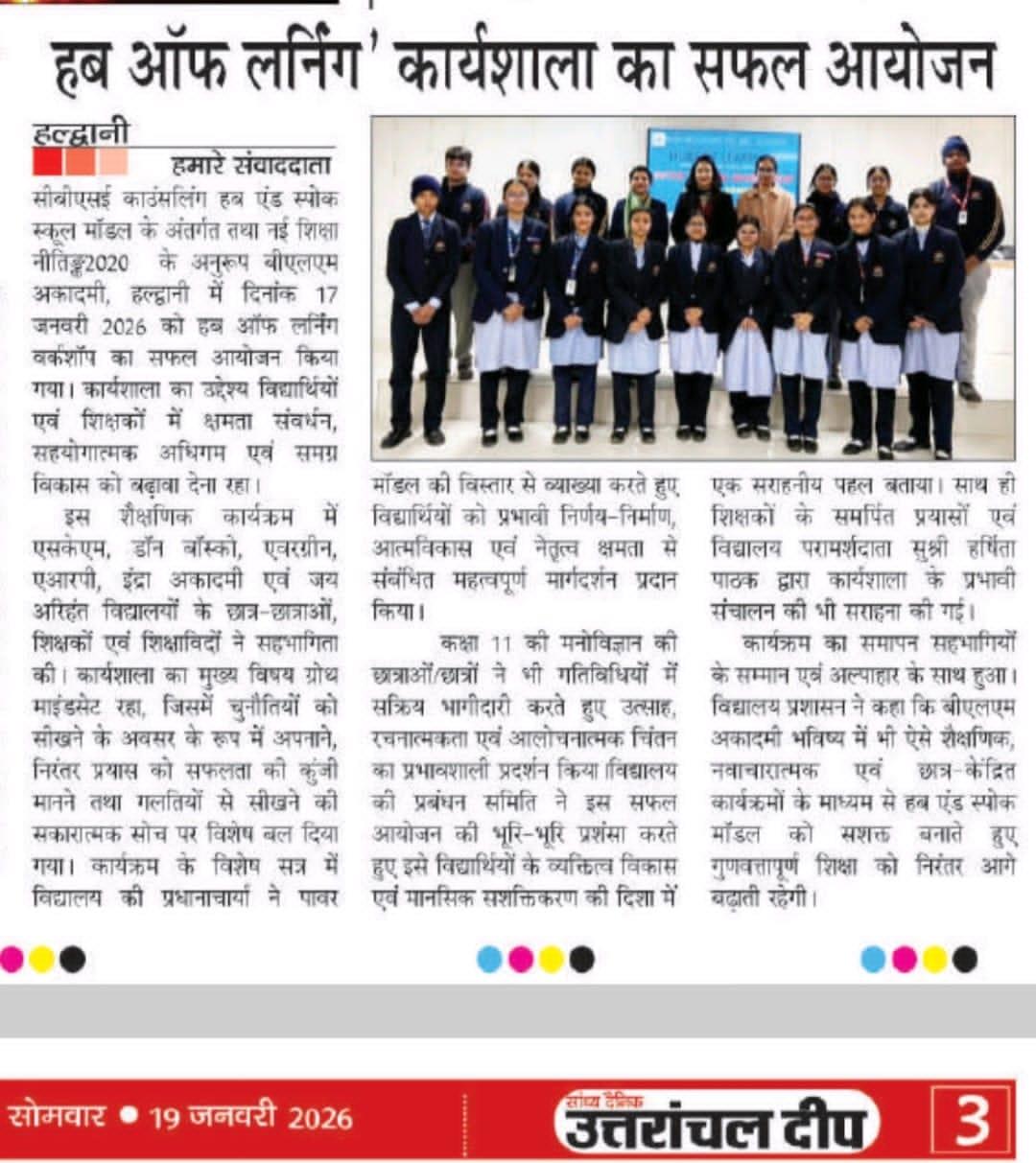 सीबीएसई काउंसलिंग हब एंड स्पोक स्कूल मॉडल के अंतर्गत तथा नई शिक्षा नीति 2020 के अनुरूप बीएलएम अकादमी, हल्द्वानी में दिनांक 17 जनवरी 2026 को हब ऑफ लर्निंग वर्कशॉप का सफल आयोजन किया गया। कार्यशाला का उद्देश्य विद्यार्थियों एवं शिक्षकों में क्षमता संवर्धन, सहयोगात्मक अधिगम एवं समग्र विकास को बढ़ावा देना रहा। इस शैक्षणिक कार्यक्रम में एसकेएम, डॉन बॉस्को, एवरग्रीन, एआरपी, इंद्रा अकादमी एवं जय अरिहंत विद्यालयों के छात्र-छात्राओं, शिक्षकों एवं शिक्षाविदों ने सहभागिता की। कार्यशाला का मुख्य विषय ग्रोथ माइंडसेट रहा, जिसमें चुनौतियों को सीखने के अवसर के रूप में अपनाने, निरंतर प्रयास को सफलता की कुंजी मानने तथा गलतियों से सीखने की सकारात्मक सोच पर विशेष बल दिया गया। कार्यक्रम के विशेष सत्र में विद्यालय की प्रधानाचार्यों ने पावर मॉडल की विस्तार से व्याख्या करते हुए विद्यार्थियों को प्रभावी निर्णय निर्माण, आत्मविकास एवं नेतृत्व क्षमता से संबंधित महत्वपूर्ण मार्गदर्शन प्रदान किया। कक्षा 11 की मनोविज्ञान की छात्राओं/छात्रों ने भी गतिविधियों में सक्रिय भागीदारी करते हुए उत्साह, रचनात्मकता एवं आलोचनात्मक चिंतन का प्रभावशाली प्रदर्शन किया।विद्यालय की प्रबंधन समिति ने इस सफल आयोजन की भूरि-भूरि प्रशंसा करते हुए इसे विद्यार्थियों के व्यक्तित्व विकास एवं मानसिक सशक्तिकरण की दिशा में एक सराहनीय पहल बताया। साथ ही शिक्षकों के समर्पित प्रयासों एवं विद्यालय परामर्शदाता सुश्री हर्षिता पाठक द्वारा कार्यशाला के प्रभावी संचालन की भी सराहना की गई। कार्यक्रम का समापन सहभागियों के सम्मान एवं अल्पाहार के साथ हुआ। विद्यालय प्रशासन ने कहा कि बीएलएम अकादमी भविष्य में भी ऐसे शैक्षणिक, नवाचारात्मक एवं छात्र-केंद्रित कार्यक्रमों के माध्यम से हब एंड स्पोक मॉडल को सशक्त बनाते हुए गुणवत्तापूर्ण शिक्षा को निरंतर आगे बढ़ाती रहेगी।